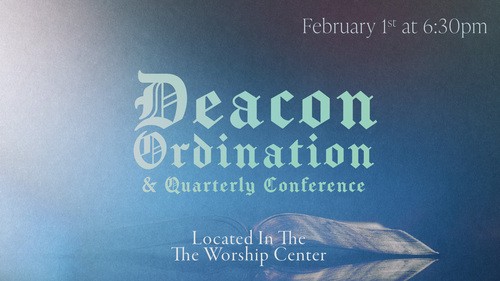 Join us in the Worship Center on Sunday, February 1st at 6:30pm for our Quarterly Conference & Deacon Ordination. We’ll take care of some business and then be blessed to participate in the ordination of our new deacons. You don’t want to miss this special evening! A reception will follow.