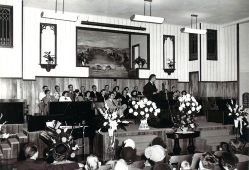 The open-air tabernacle was closed in 1950 to provide a larger sanctuary needed to handle new growth. A new preschool building was also built during this era.